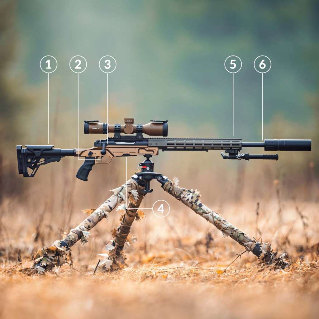 Whether on a bipod or a tripod, whether aimed, laid down, standing or prone: the LR/ONE from Haenel weighs in at 4.8 kilograms, making it a handy long-range rifle that will inspire sportsmen with ambitions up to around 800 meters.