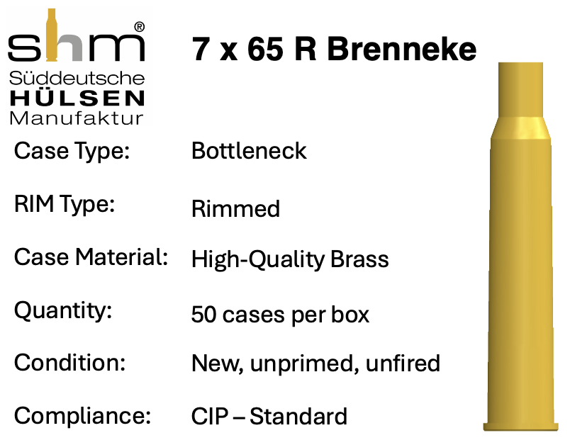 The 7x65R Brenneke is the rimmed companion to the well-known 7×64, introduced in 1917 by German designer Wilhelm Brenneke. Built for break‑action rifles and combination guns, it delivers excellent accuracy, strong downrange energy, and reliable performance on medium to large game. Ballistics are comparable to .280‑class cartridges, making it a popular choice for deer, boar, and elk‑size animals. Its efficient case design ensures smooth extraction in single‑shot and double rifles, while maintaining the flat trajectory and terminal performance Brenneke cartridges are known for.