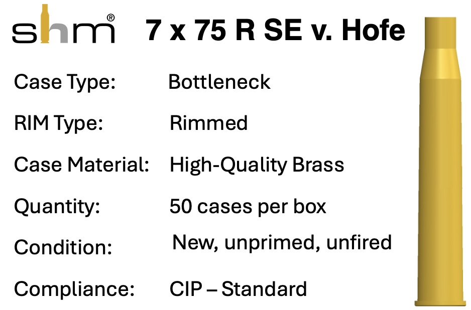 The 7x75R SE vom Hofe is a powerful, long‑range German hunting cartridge developed around 1930 by master gunsmith August vom Hofe. Designed specifically for break‑action rifles and combination guns, it delivers exceptional velocity, flat trajectory, and strong terminal performance on medium to large game. The cartridge is known for its efficient case design, excellent accuracy, and reliable extraction in single‑shot and double‑rifle platforms. Hunters value the 7x75R SE for its blend of classic European engineering and modern ballistic capability, making it a standout choice for demanding hunting situations.