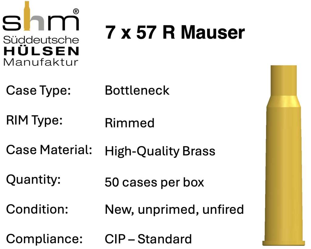 The 7×57 Mauser is a legendary European cartridge introduced in 1892 by Paul Mauser. Known for its excellent accuracy, mild recoil, and deep penetration, it has been used worldwide for deer, boar, and even large game. Ballistics are comparable to modern 7mm mid‑class cartridges, making it a favorite among hunters and precision shooters. Its efficient case design provides smooth feeding and consistent performance in bolt‑action rifles. The 7x57R is the rimmed companion to the 7×57 Mauser, designed for break‑action rifles, single‑shots, and combination guns. It offers the same proven accuracy, mild recoil, and excellent terminal performance, with reliable extraction in double rifles and drillings. Ideal for deer, boar, and medium‑size game, the 7x57R remains a popular choice among European hunters and fans of traditional rifle platforms.