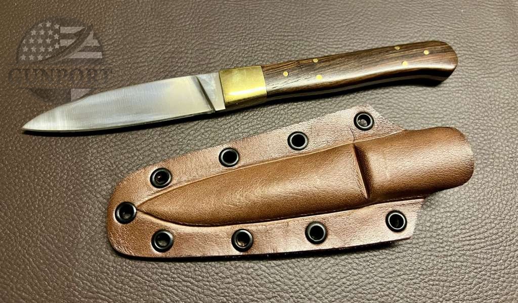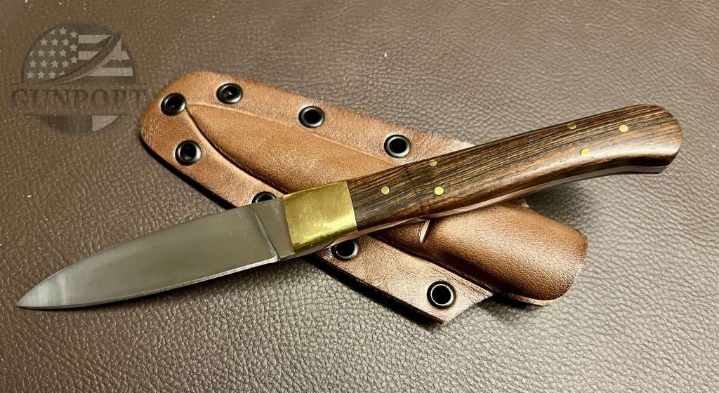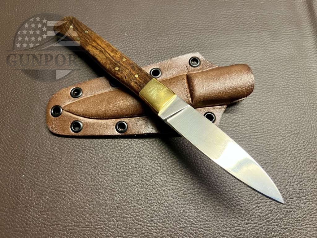 The handle is made from premium walnut wood, giving the knife a timeless, natural look and a warm, ergonomic grip. A brass bolster adds both style and strength, complementing the rich tone of the wood.