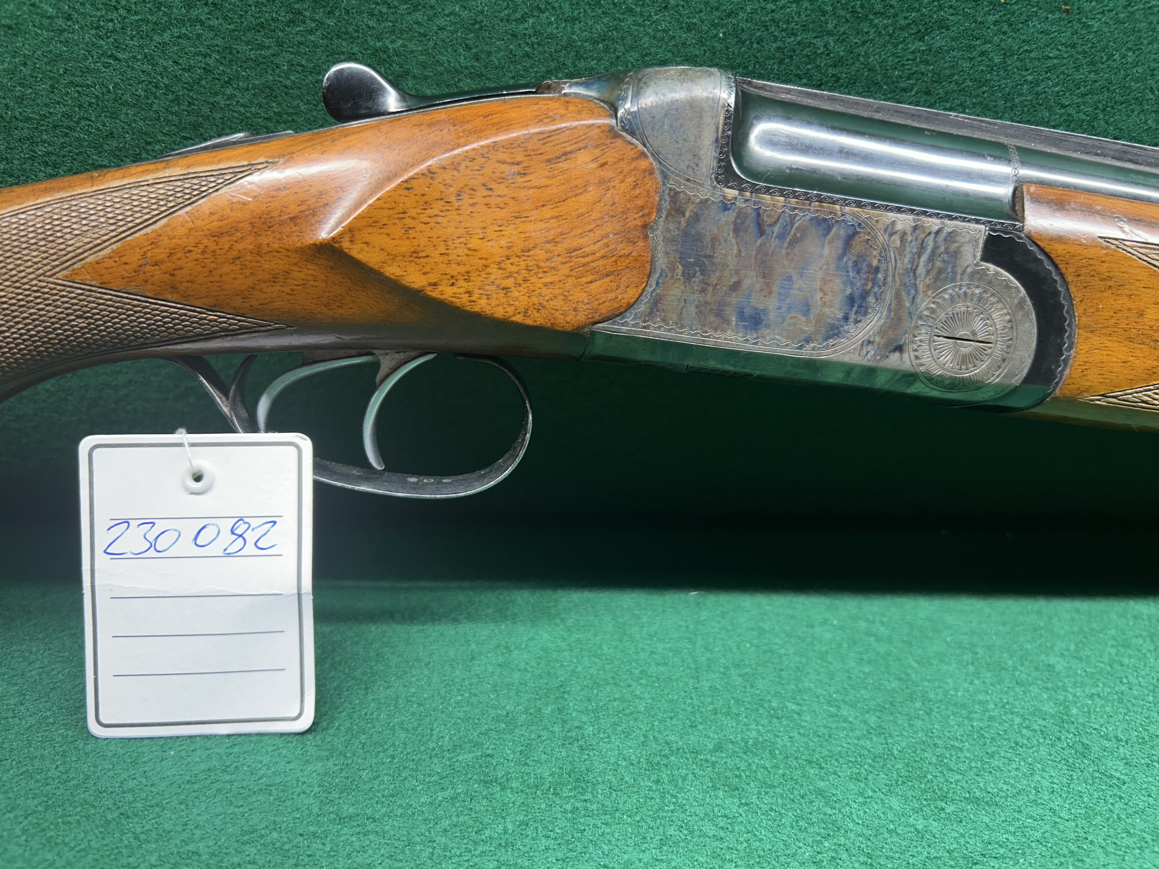 This double trigger over/under 12 gauge shotgun has a beautiful color case hardened receiver. The stock is a lighter colored wood that does show some surface scratches.  No major dents, dings or cracks. This gun has a tight action and a lot of life left in her. She looks good and shoots great.