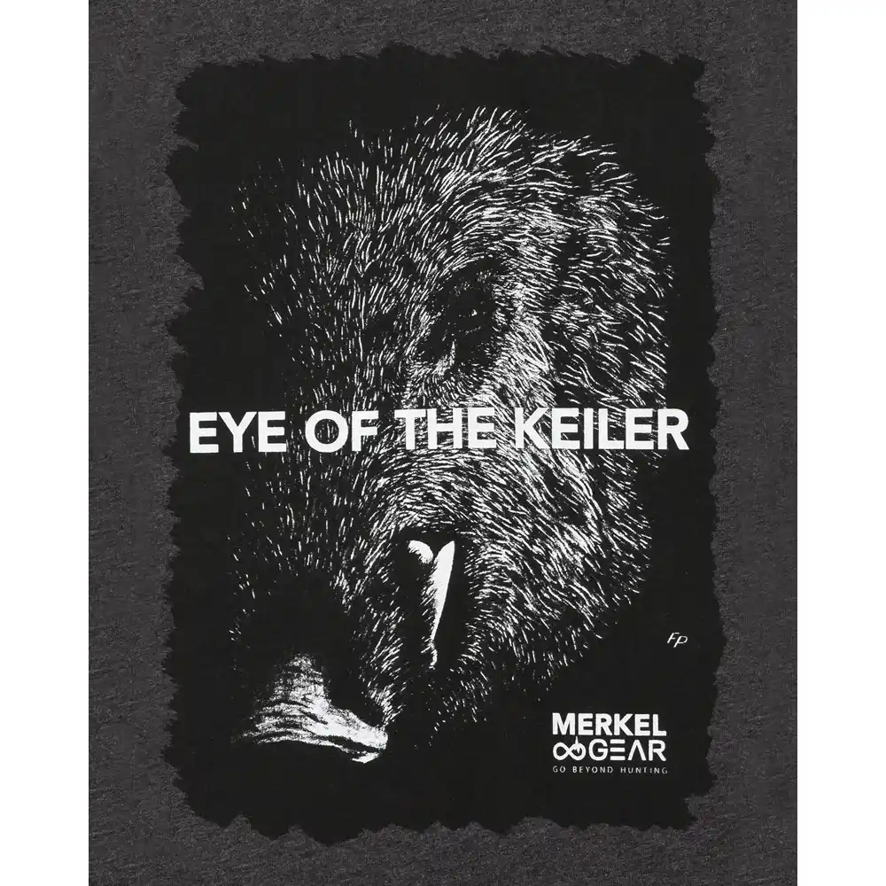 MerkelGEAR T-shirts are made from 100% premium cotton and boast an impressive, and sadly rare these days, fabric weight of over 200 g/m². This shirt is equally suitable for hunting and leisure activities. The fit is relatively straight and only slightly fitted. A large wild boar print adorns the front of the shirt. The artwork was created by a Merkel engraver! The slogan “Eye of the Wild Boar” is also featured. The MerkelGEAR logo is subtly displayed on the back right shoulder. The shirt is cut slightly longer in the back to prevent it from riding up during backpacking trips.