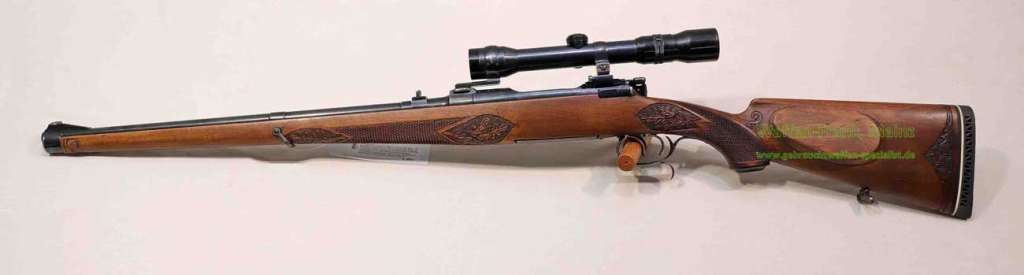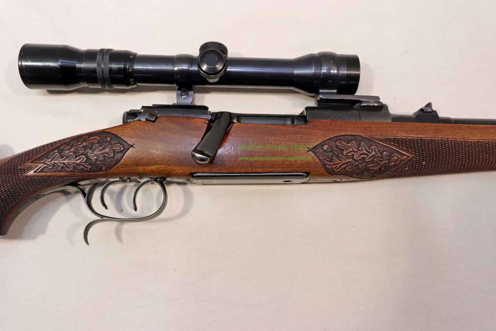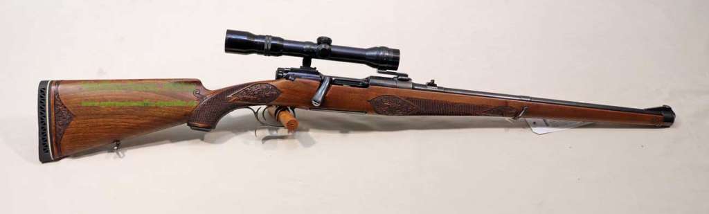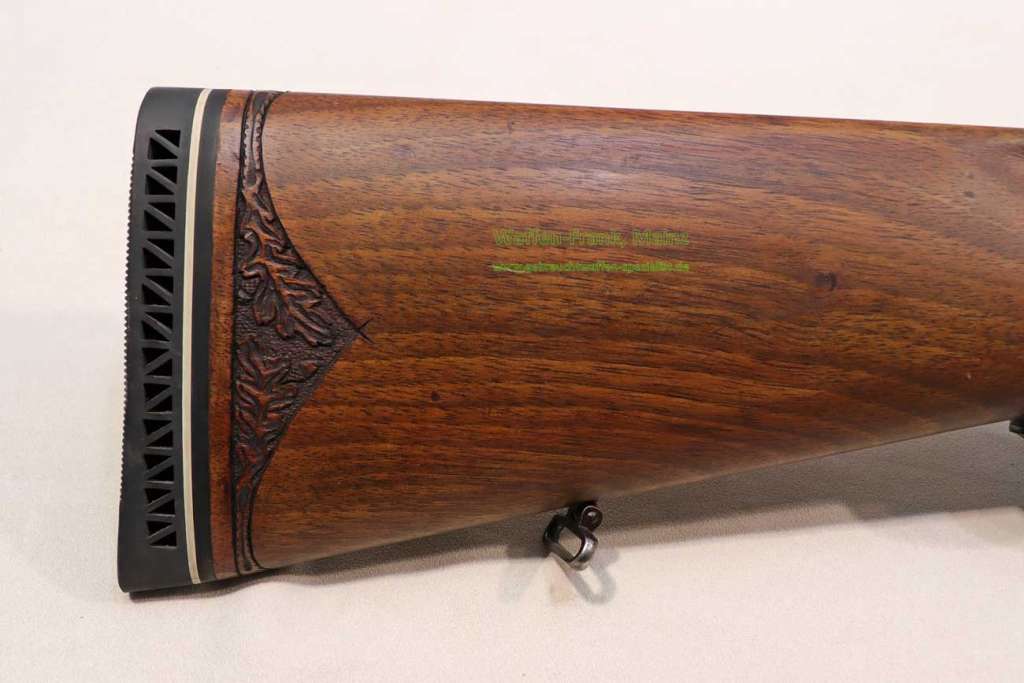 Original condition, very rare in this caliber as a carbine, bore mirror-bright, bluing on barrel and action slightly mottled, with German set trigger (also suitable as a two-stage trigger), later custom-made with a finger hook on the trigger guard, original carbine stock with later carving, German cheekpiece for right-handed shooters, stock length including rubber buttplate 370mm, Suhl tripod claw mount, with offset fore-end and Kahles steel scope Mod. Helia 2.3-7×32, reticle: 1, fully overhauled, with 5+1 round rotary magazine, wing safety with additional side trigger safety/type MC, in this configuration therefore perfect for stalking and driven hunts…