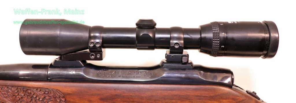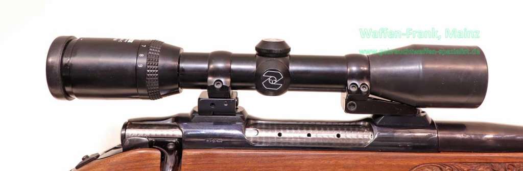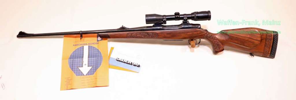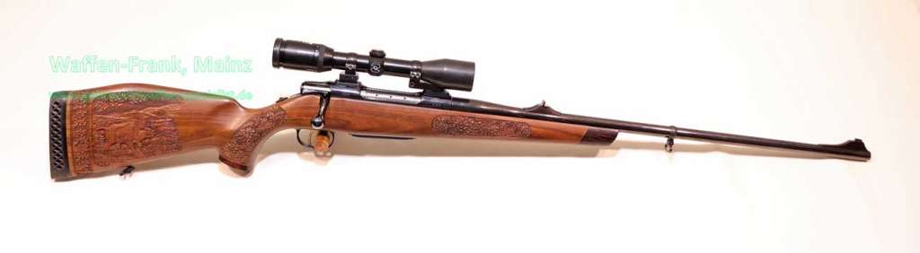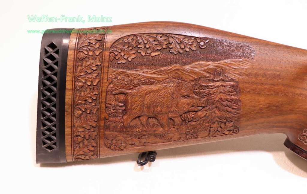 Unused safe-keeping rifle, with exceptional factory proofing (only 20mm grouping in 3 shots at 100m), and instruction manual. Purchased specifically for a hunting trip abroad, which unfortunately never took place. Features include the unparalleled smoothness of the bolt action, thanks to the patented support-flap bolt with locking mechanism in the receiver bridge, gold-plated combination trigger, sunburst finish on the bolt cylinder, and an additional Magnaport muzzle port (reducing recoil and muzzle rise by approximately 20%). It comes with a detachable 3+1 round steel magazine, an EAW Magnum swing mount with a Zeiss Diavari-C 3-9×36 scope (30/30 reticle in the second focal plane), and the eyepiece still has its original rubber grip. The well-grained walnut stock features a hardwood butt plate and high-quality oak leaf carving, with a boar motif on the right side of the buttstock. This configuration is still available. The ultimate solution for big game hunters worldwide, even beyond 300m…..