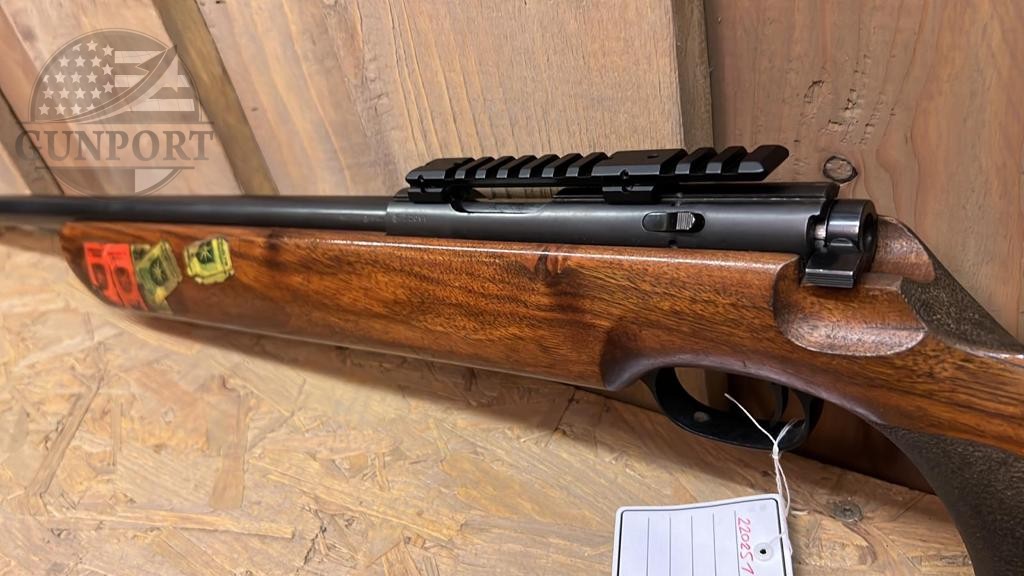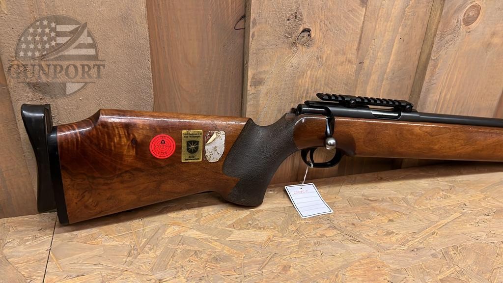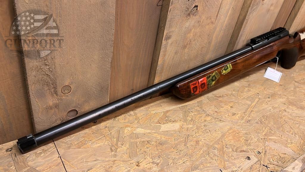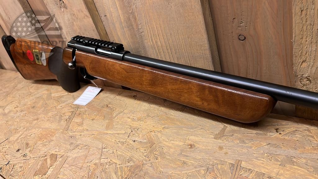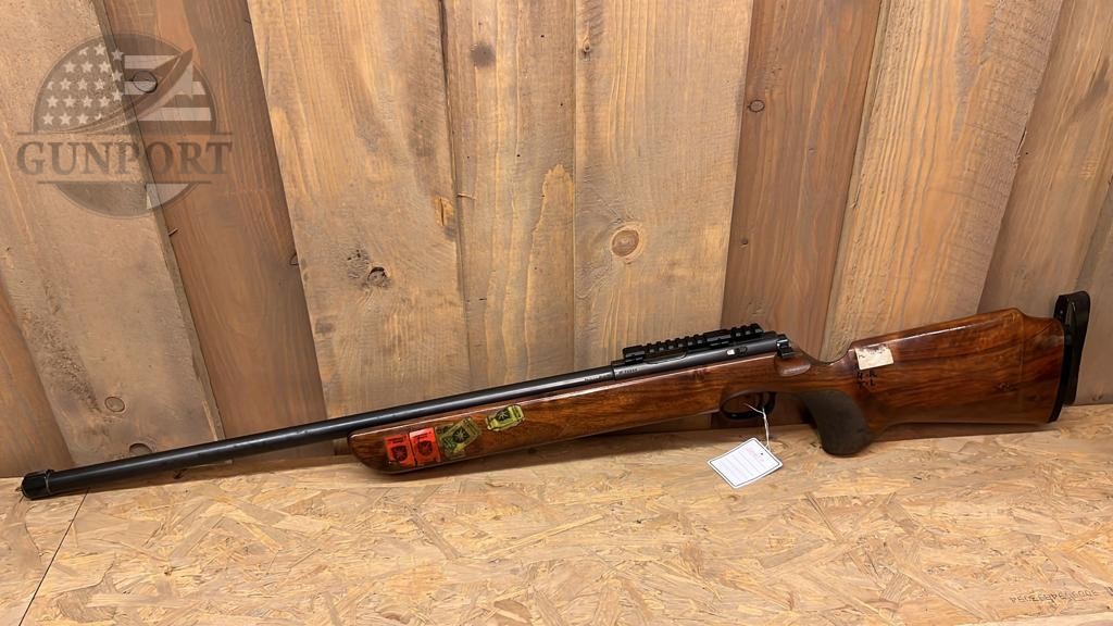 A fine example of German precision — this Walther .22 Long Rifle target rifle dates from the late 1970s and was built with the match shooter in mind. Walther’s sport/target line from this era is known for heavy, factory free-floating barrels, purpose-built target sights and adjustable match triggers, all assembled into ergonomically shaped competition stocks that allow for repeatable hand position and superior stability on the bench or standing course.